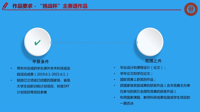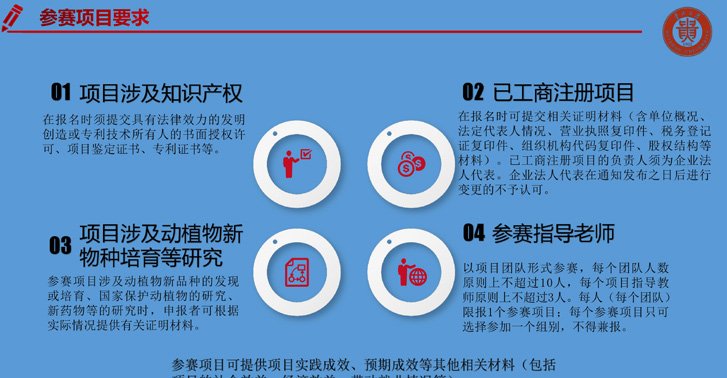 (要注意的是賽事競賽規則每一屆可能會有變動,想參賽的同學一定要以當屆公布的最新文件要求為準)申報條件:1.參賽項目應有較高立意,積極踐行社會主義核心價值觀。