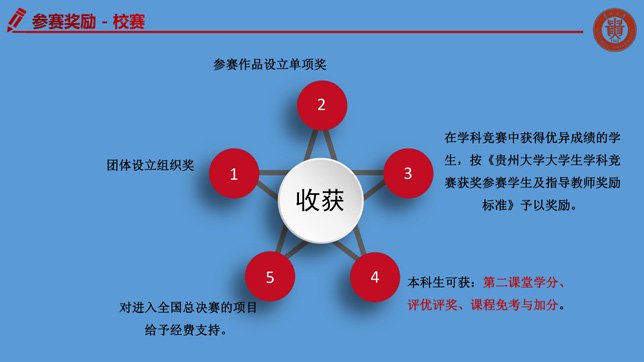 提交材料:項目報名表(約3000字)、項目介紹材料(20頁以內的PPT)、其他有關證明材料(選報)。其他注意事項獎勵獎項:貴州大學高度重視和支持學生競賽活動,