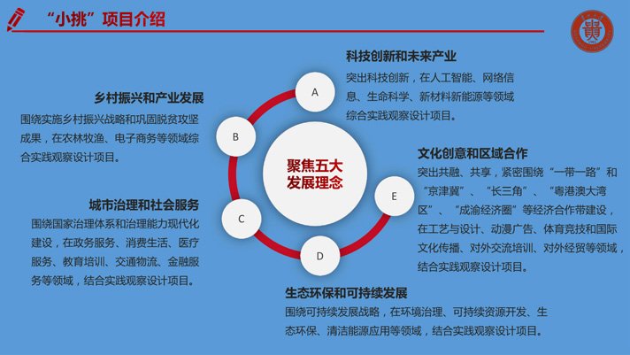 競賽組別:2022年“小挑”聚焦創新、協調、綠色、開放、共享五大發展理念,設鄉村振興和產業發展、城市治理和社會服務、科技創新和未來產業、文化創意和區域合作、生態環保和可持續發展五個組別。