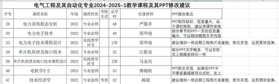 全體教師針對電力市場、高壓直流輸電、靈活交流輸電技術、電力系統調度自動化、電力系統設計規程與規范、電力系統負荷預測、儲能原理與技術概論、配電網運行控制仿真、高等電力系統分析、數字電子技術、電子技術課程設計、綜合電子電路設計、電力系統穩態分析、電力電子技術、電力電子技術課程設計、單片機原理及接口技術、單片機原理及接口技術課程設計、電機學2-2、技術經濟學、電氣工程及其自動化專業認知、電路原理1-1、科技論文寫作、電磁場概論、程序設計等2024秋冬學期全部課程的教學PPT課件,集體討論,提出修改意見和建議。