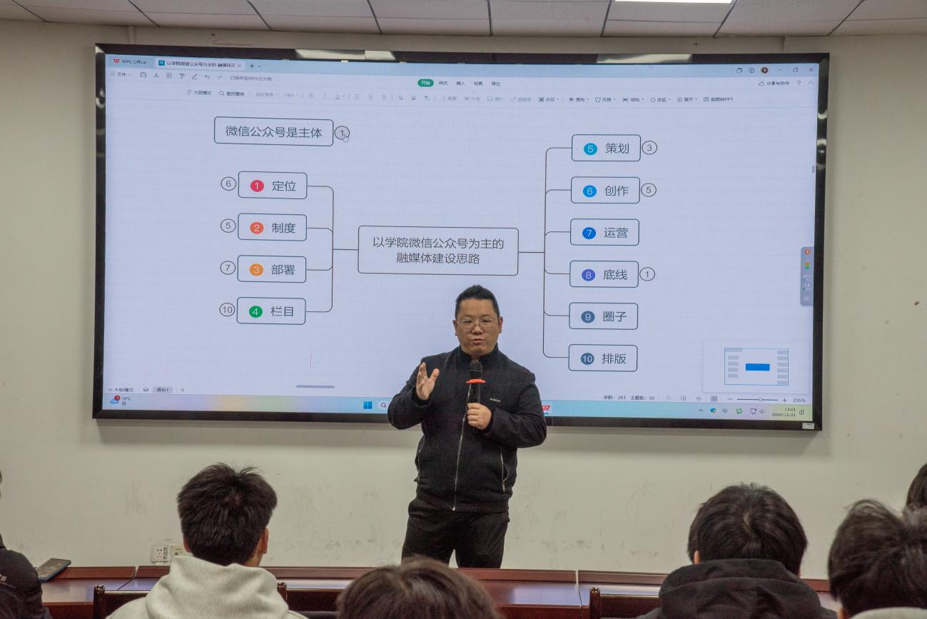 2024年11月21日,為了提升學(xué)院融媒體成員的工作能力,為學(xué)院微信公眾號(hào)的建設(shè)提供新思路,學(xué)院邀請(qǐng)學(xué)校宣傳部龐愛(ài)忠老師在電工院609會(huì)議室為同學(xué)們進(jìn)行工作能力培訓(xùn)。學(xué)院融媒體中心全體成員、2024級(jí)全體宣傳委員參加會(huì)議。