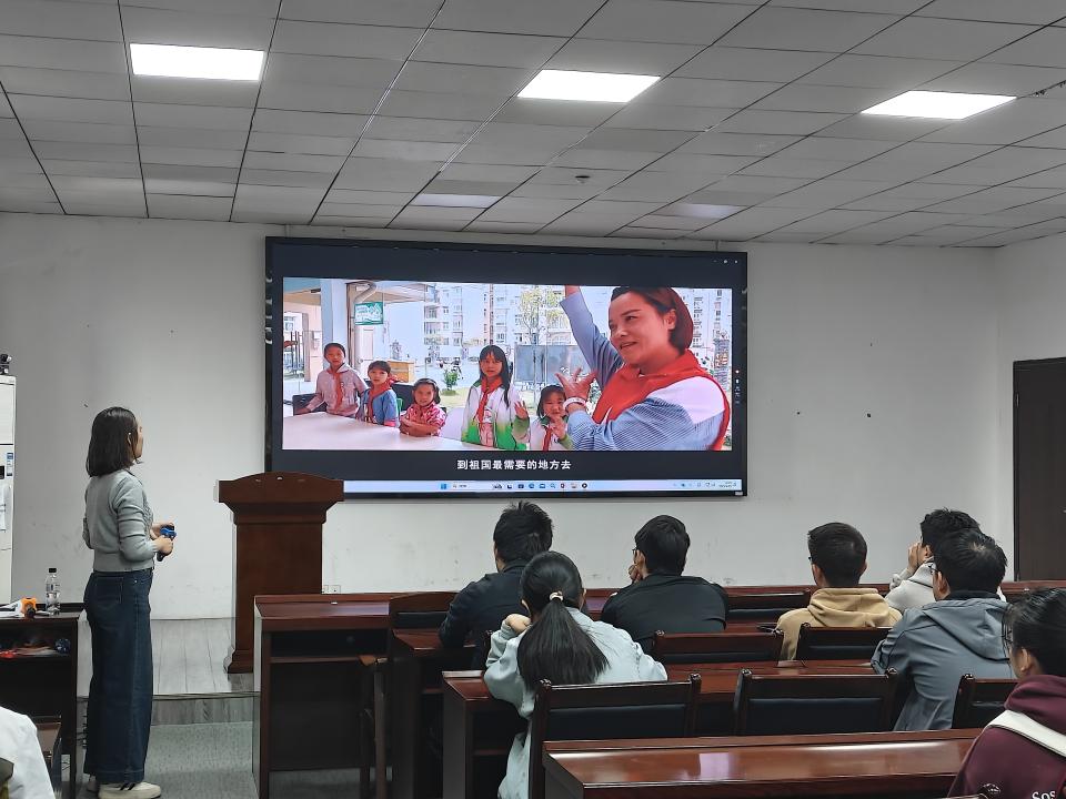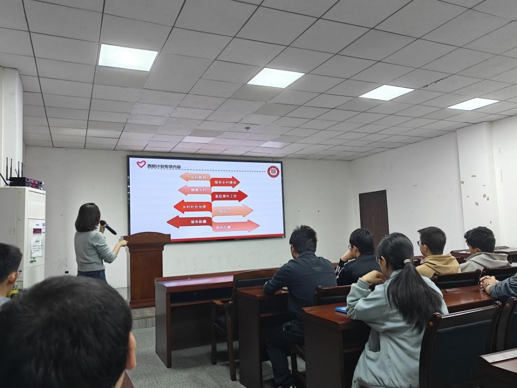 宣講會上,余紅以“什么是西部計劃”開場,對西部計劃進行簡要介紹,從項目類別及專項內容、選拔標準及進度安排、資金保障與安排等方面進行詳細解讀,幫助同學們明晰要點。隨后播放西部計劃宣傳視頻,一幀幀畫面重現了西部志愿者在基層服務中的點點滴滴,讓在場同學感受他們用青春和汗水書寫的別樣人生。隨后,與會學生就服務地分配、專業匹配度、考研升學等問題踴躍提問,老師逐一細致解答。