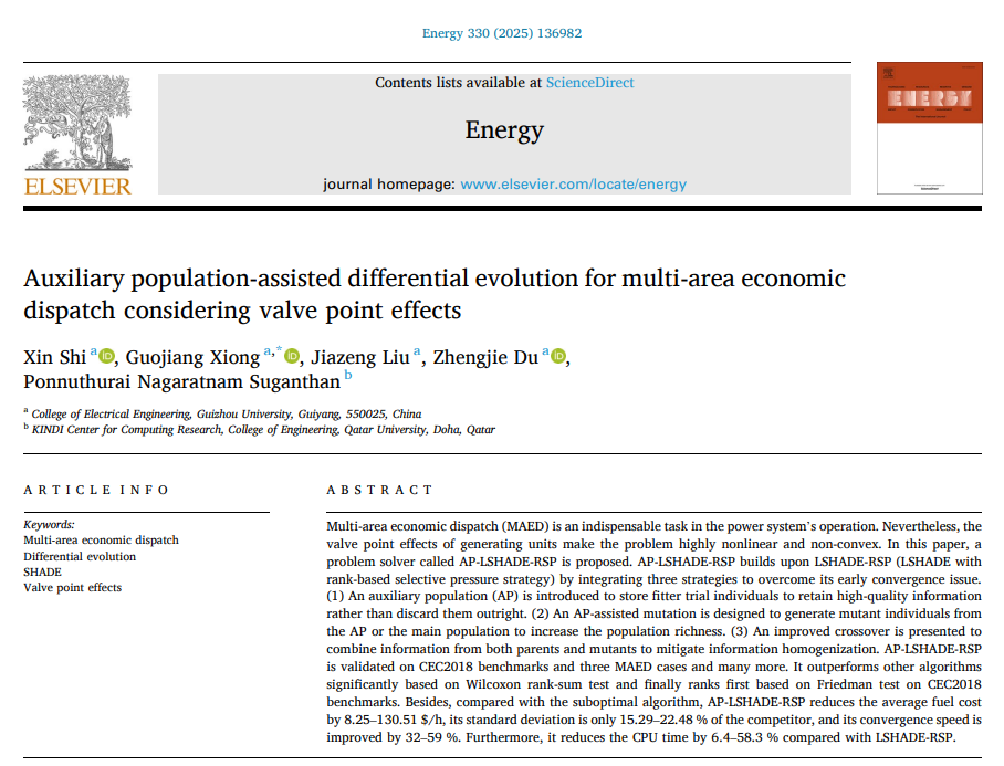 該項發表在《Energy》上的研究針對電力系統經濟調度中的關鍵技術難題——閥點效應,提出了一種基于輔助群體差分進化算法的創新求解方法——AP-LSAHDE-RSP。閥點效應是火力發電機組運行中的特有現象,會導致機組耗量特性曲線非凸不連續,給電力系統經濟調度帶來巨大挑戰。該研究成果有效解決了多區域經濟調度中因閥點效應引發的優化難題,顯著提升了系統的經濟性與穩定性,為復雜電力系統的優化運行提供了新的解決方案。